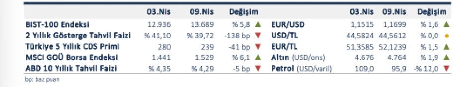 BIST-100 endeksi de küresel piyasalardaki olumlu havanın desteğiyle Perşembe kapanışı itibarıyla geçtiğimiz haftanın Cuma gününe kıyasla %5,8 oranında artış kaydetti. Türkiye’nin 5 yıllık CDS risk primi Perşembe günü haftalık bazda 49 baz puan düşerek 239 düzeyine gerilese de, halen savaş öncesi seviyelerinin üzerinde seyrediyor. Bu dönemde TL, USD karşısında yatay seyrederken euro karşısında bir miktar değer kaybetti.
