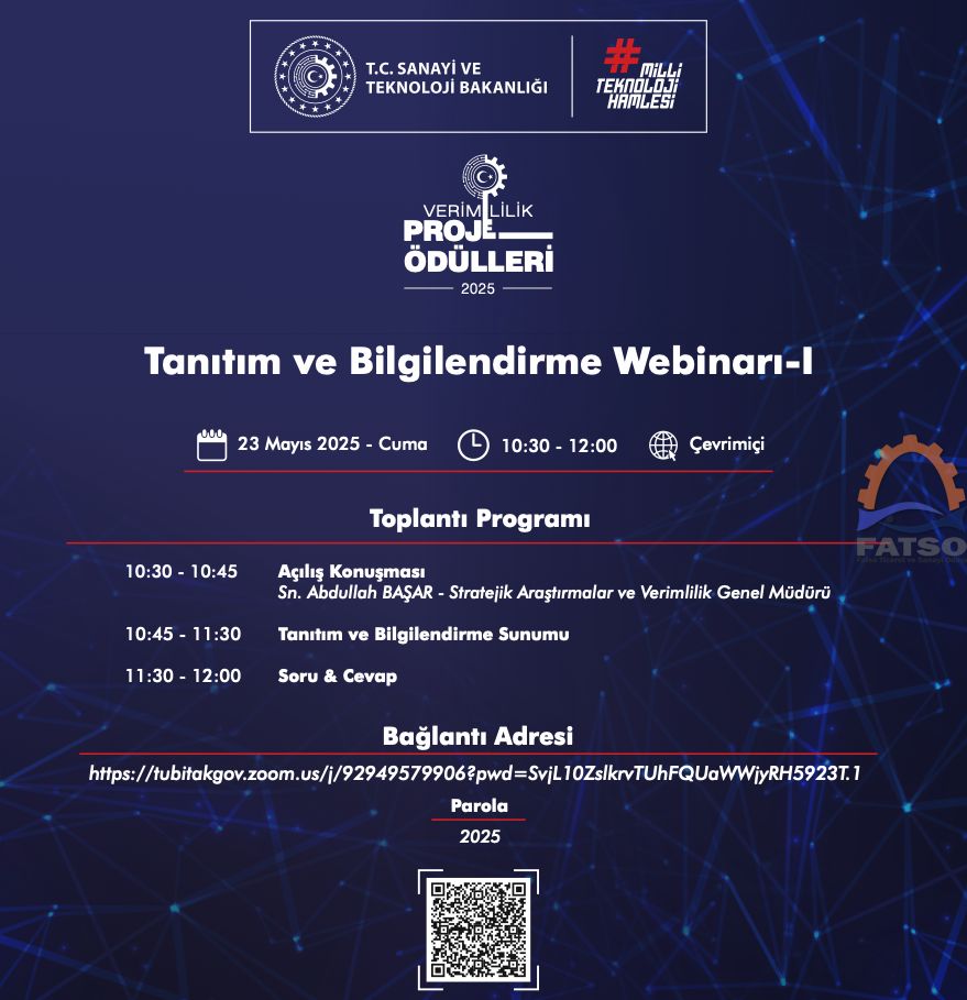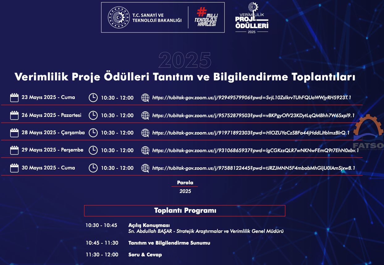 Sanayi ve Teknoloji Bakanlığı'nca, verimlilik uygulamalarının başta işletmeler olmak üzere toplumun her kesiminde bilinmesi ve yaygınlaştırılmasına yönelik olarak 2014 yılından itibaren Verimlilik Proje Ödülleri yarışması düzenlenmektedir. Bu doğrultuda başlatılan Verimlilik Proje Ödülleri 2025 yılı yarışma sürecine "2025 Verimlilik Proje Ödülleri Tanıtım ve Bilgilendirme Toplantıları Takvimi ve Webinarı"na ilişkin bilgiler duyurumuz einde yer almaktadır.